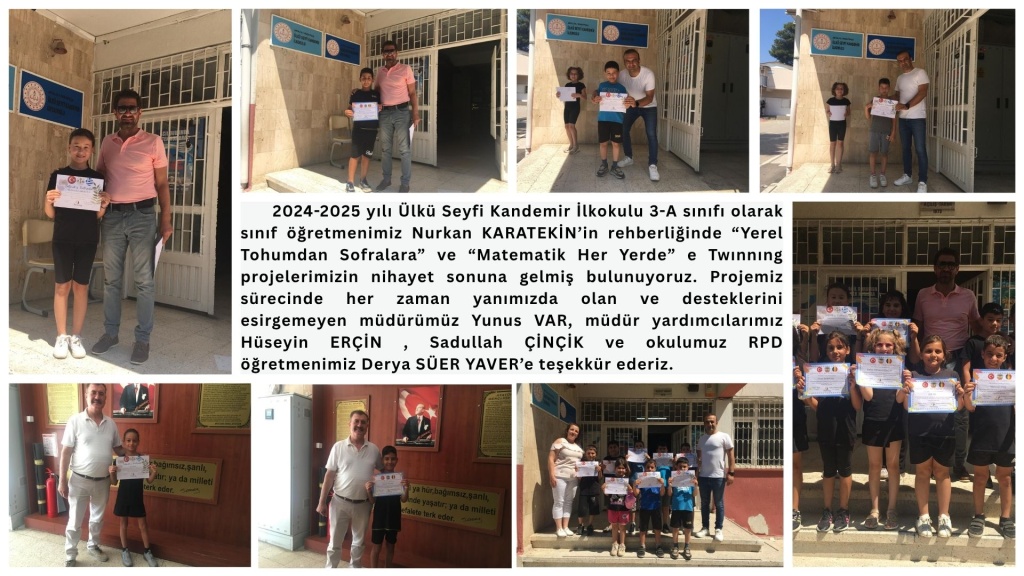 2024-2025 yili Ülkü Seyfi Kandemir ilkokulu 3-A sinifi olarak sinif ögretmenimiz Nurkan KARATEKIN'in rehberliginde "Yerel Tohumdan Sofralara" ve "Matematik Her Yerde" e Twinning projelerimizin nihayet sonuna gelmis bulunuyoruz. Projemiz sürecinde her zaman yanimizda olan ve desteklerini esirgemeyen müdürümüz Yunus VAR, müdür yardimcilarimiz Hüseyin ERÇiN , Sadullah ÇiNÇiK ve okulumuz